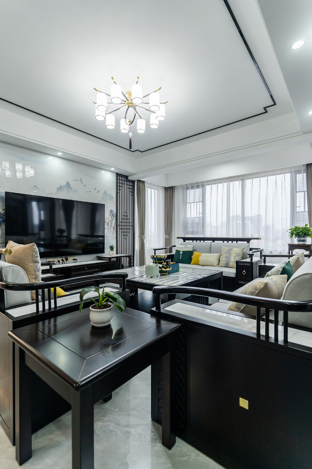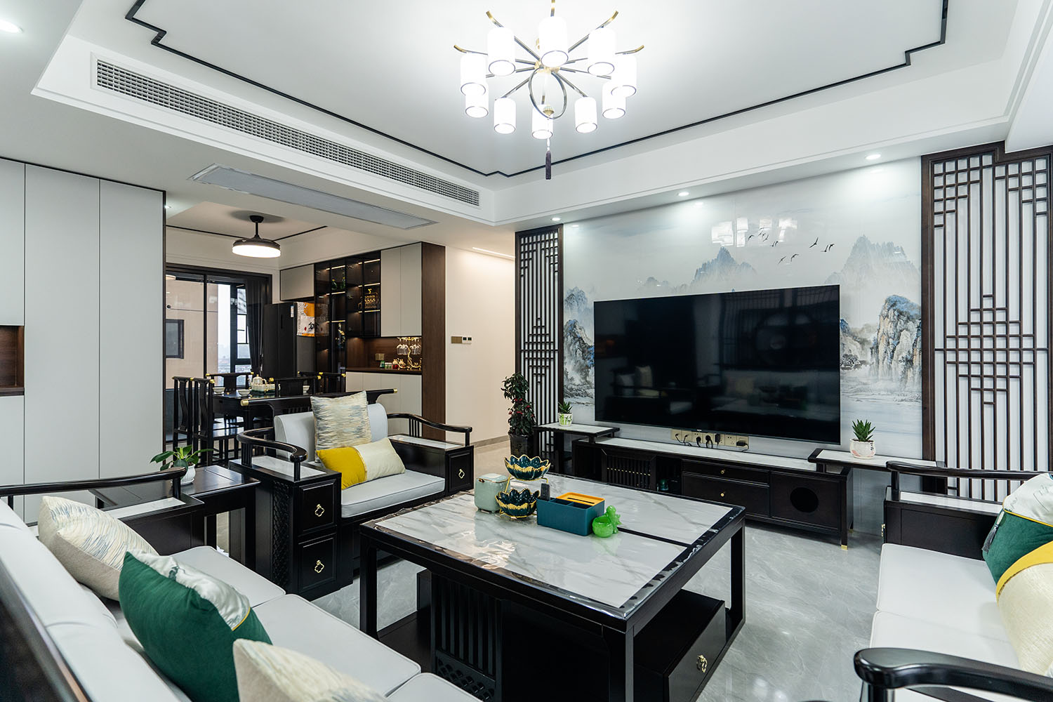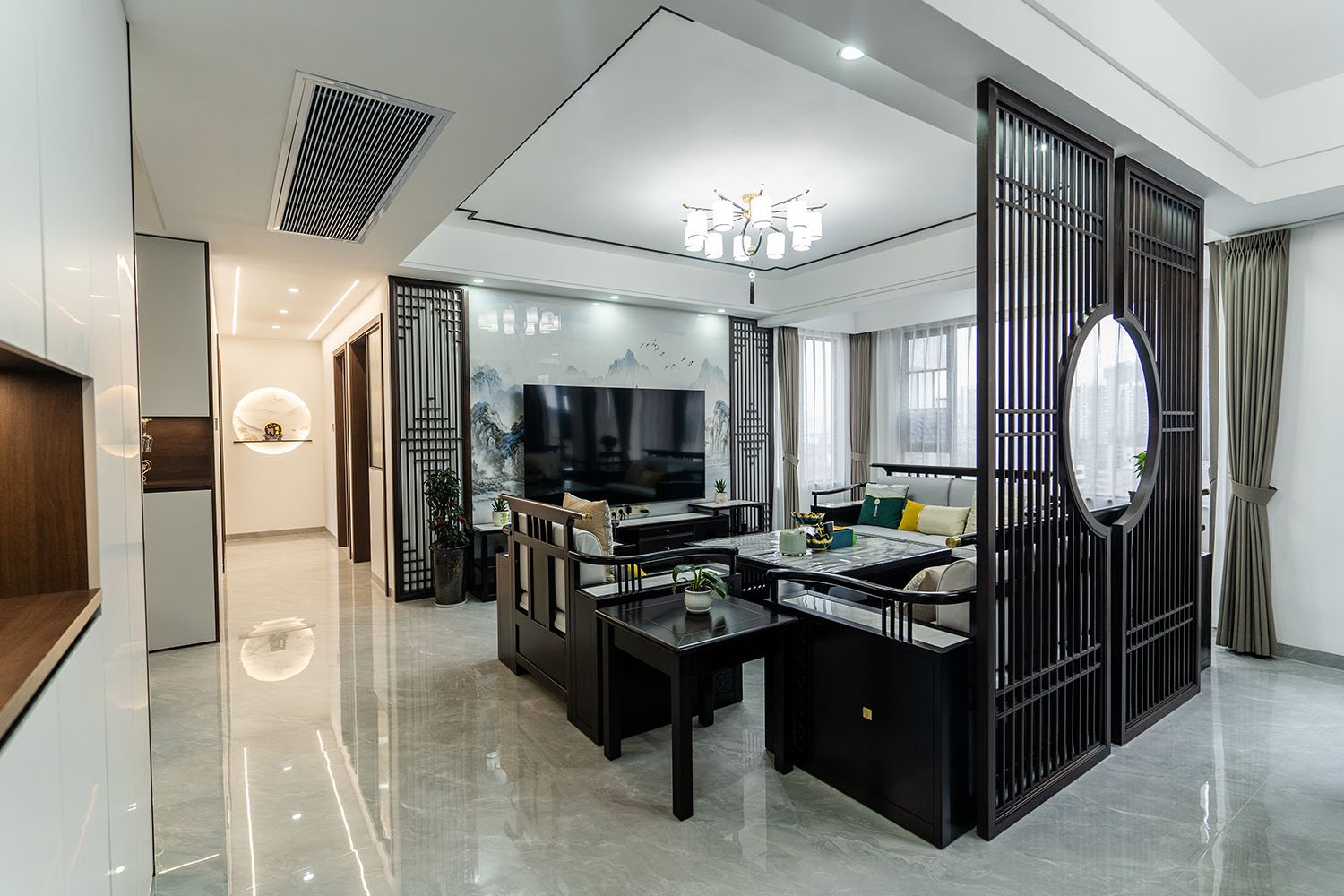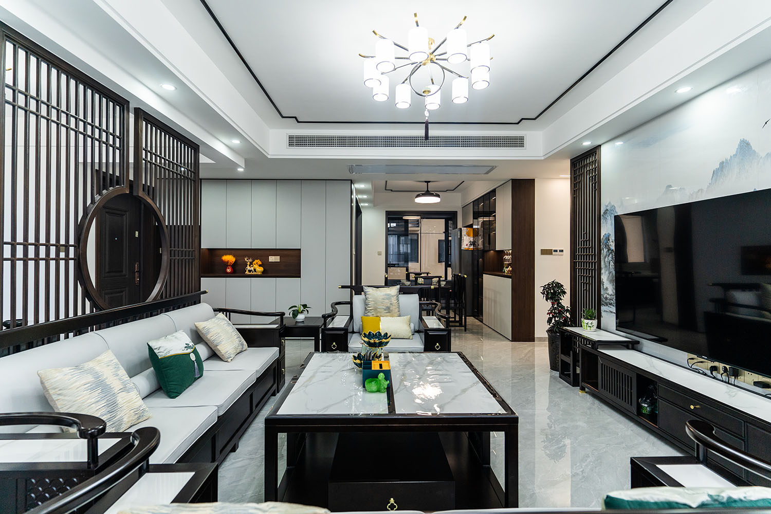 本案位于坐拥自然资源的株洲雪峰山壹号小区,为一套123平米的住宅。设计师以 “现代框架,东方意境” 为核心理念,将传统中式的风骨与现代居住的舒适性相融合,通过对称的布局、简化的中式元素与自然材质的运用,打造出一处既有文化底蕴,又符合当代生活节奏的诗意栖居。 在这123平米的空间里,新中式风格并非元素的简单堆砌,而是通过对传统美学的提炼与现代手法的转译,将山水的意境、东方的对称美学与宜居的现代功能完美结合。它既保留了传统文化的风骨,又展现出契合时代的气度,为居住者创造了一个能安放身心、传承文脉的现代雅居。