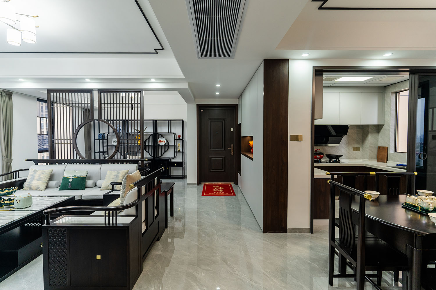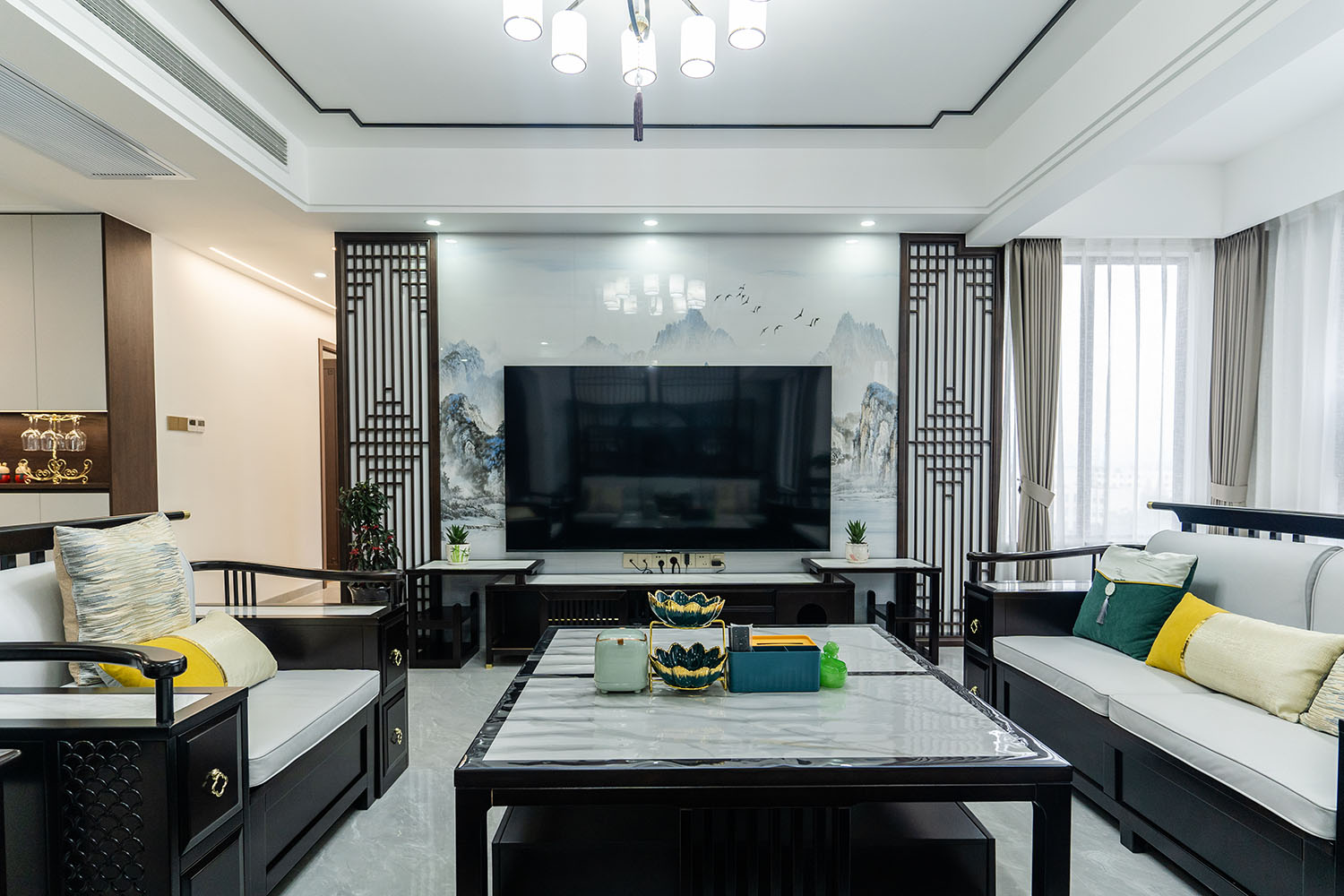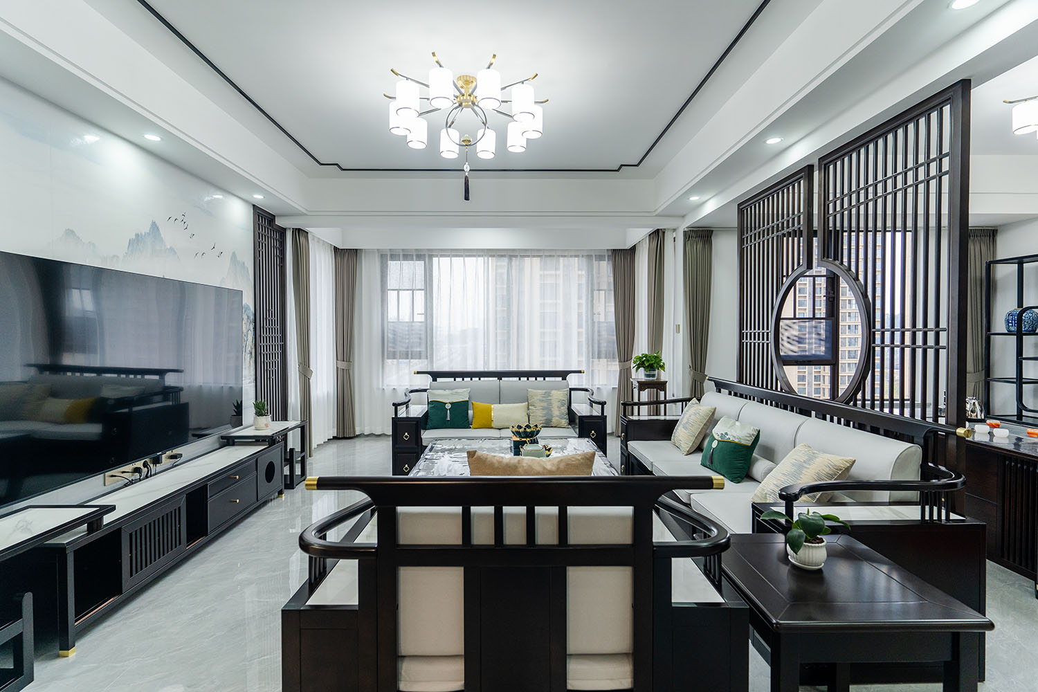 本案位于坐拥自然资源的株洲雪峰山壹号小区,为一套123平米的住宅。设计师以 “现代框架,东方意境” 为核心理念,将传统中式的风骨与现代居住的舒适性相融合,通过对称的布局、简化的中式元素与自然材质的运用,打造出一处既有文化底蕴,又符合当代生活节奏的诗意栖居。 在这123平米的空间里,新中式风格并非元素的简单堆砌,而是通过对传统美学的提炼与现代手法的转译,将山水的意境、东方的对称美学与宜居的现代功能完美结合。它既保留了传统文化的风骨,又展现出契合时代的气度,为居住者创造了一个能安放身心、传承文脉的现代雅居。
