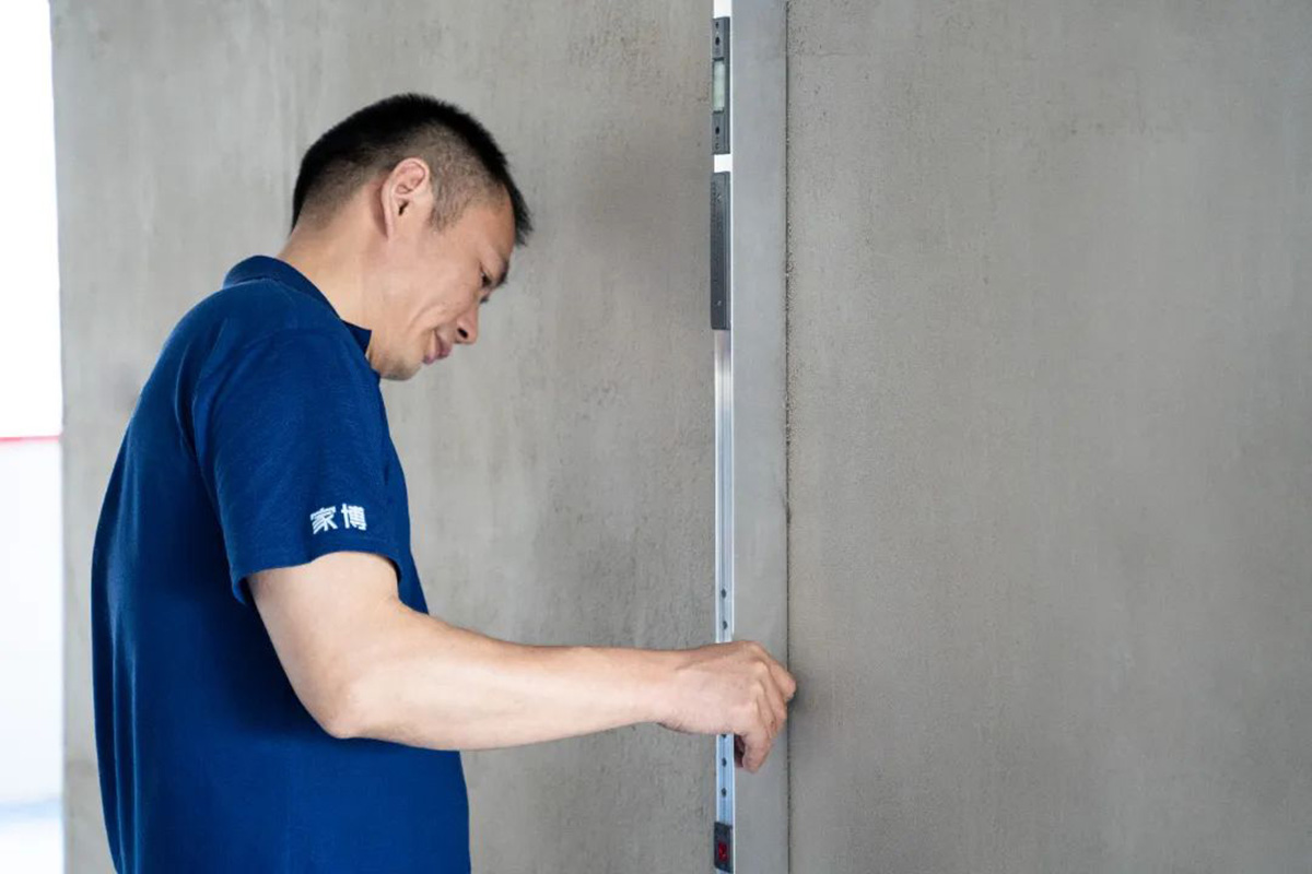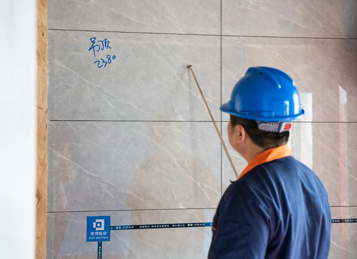 ▲质检组使用2米水平靠尺检测墙面平整度。墙面的平整度是影响整体视觉效果最重要的因素之一,因此每一次巡检,墙面检查都是重中之重。